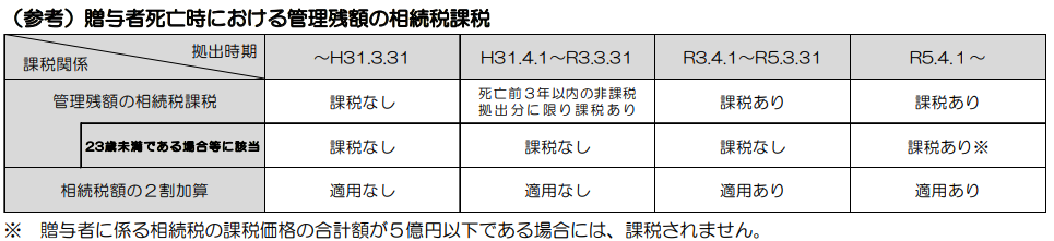- 受贈者が23歳未満等で、贈与者の相続税課税価格が5億円以下の場合、 管理残額を相続税の対象外とする例外を追加
