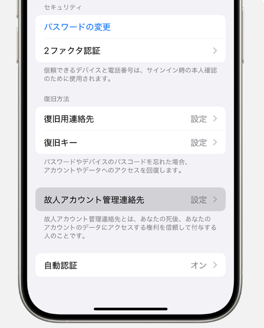 もうひとつ印象に残ったのが、Apple製品に搭載されている「故人アカウント管理連絡先(Legacy Contact)」という機能です。